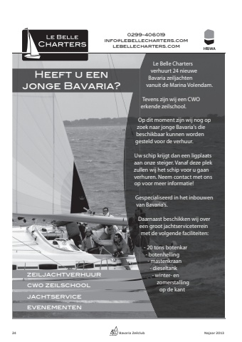 24 Bavaria Zeilclub Najaar 2013LangszijLe Belle Charters verhuurt 24 nieuwe Bavaria zeiljachten vanuit de Marina Volendam.Tevens zijn wij een CWO erkende zeilschool.Op dit moment zijn wij nog op zoek naar jonge Bavaria's die beschikbaar kunnen worden gesteld voor de verhuur. Uw schip krijgt dan een ligplaats aan onze steiger. Vanaf deze plek zullen wij het schip voor u gaan verhuren. Neem contact met ons op voor meer informatie!Gespecialiseerd in het inbouwen van Bavaria's.Daarnaast beschikken wij over een groot jachtserviceterrein met de volgende faciliteiten:- 20 tons botenkar - botenhelling- mastenkraan- dieseltank- winter- en zomerstalling op de kantzeiljachtverhuurcwo zeilschooljachtserviceevenementen0299-406019info@lebellecharters.comlebellecharters.comHeeft u eenjonge Bavaria?